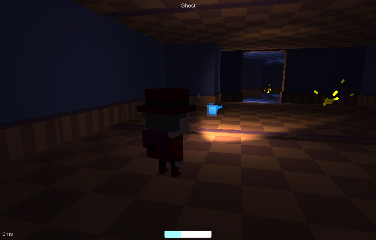 We made a simple multiplayer game in which the person with the Oculus Rift is a ghost hunter in an abandoned house while the other players play as ghosts. Ghosts start out fully transparent, but gradually become more visible and die when they become fully opaque. Thus, the goal of the ghosts is to try to kill the ghost hunter while trying to keep their transparancy up. For this they have invisibility pickups that sometimes randomly appear in the house. The ghost hunter has a flashlight to protect him from the ghosts. When a ghost gets caught in the light, it rapidly becomes visible and dies. Unfortunately for the ghost hunter, the flashlight depletes quickly, after which he has to wait a couple of seconds before he can use it again. For him there are energy powerups to help keep his flashlight charged.