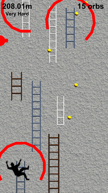 I made this prototype while working at PreviewLabs. The client wanted a vertical ladder climber for the iPhone 5 with different kinds of ladders. Steel ladders (blue) don't do anything special, wooden ladders (brown) start disintegrating from the top as soon as you start climbing them and rope ladders (white) start burning from the bottom when you climb them. There are moving ladders, different kinds of obstacles and special power orbs that give you temporary bonuses. The user can climb by touching the screen in the direction he wants to go to and jump by tapping or swiping sideways.